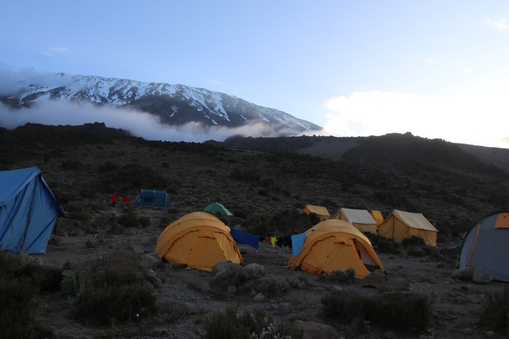 We klimmen weer dezelfde berg op die we gisteren voor acclimatiseren hadden beklommen. Pad gaat behoorlijk uitdagend steil omhoog met af en toe handen en voeten werk. Ongelooflijk dat die dragers dit zonder problemen oplopen. Dit keer gaan we na het hoogste punt verder omhoog. ‘s Ochtends is er nog geen bewolking en hebben we mooi uitzicht op Kilimanjaro.