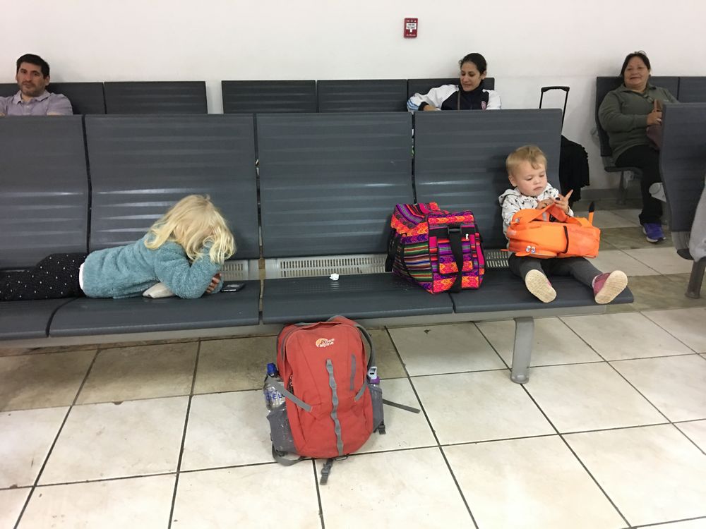 De taxi komt ons vroeg ophalen want onze vlucht vertrekt om 6:40 en dat betekent om 5:40 op het vliegveld zijn. Dat vinden de meisjes veel te vroeg en onder protest gaan ze mee.