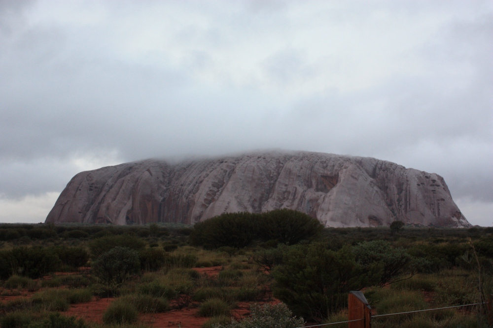 Eenmaal aangekomen bij Ayers Rock konden we door de dikke wolkenlaag geen zonsondergang zien. Wel enkele foto’s gemaakt van een dik wolkendek dat zich als een deken om Ayers Rock heen krult.