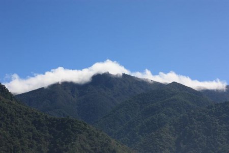 Het is een interessante tocht. Eerst slingert de weg lang omhoog en na een tijdje rijden we in mist of laaghangende bewolking. Het zicht is geregeld maar een paar meter en de mist kruipt als een dikke damp over de weg, alsof het vloeibare stikstof is. Bijzonder om te zien. De omgeving is een soort mysterieus woud waar je af en toe wat verder kan zien en daarna weer alleen silhouetten van bomen.