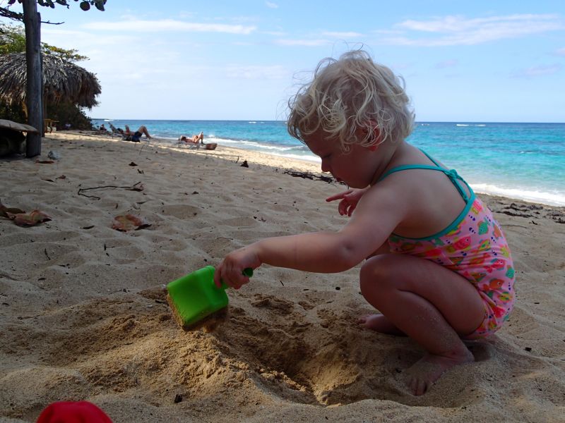 We spelen lekker met Anika in de zee die voor het eerst levende krabben ziet en allerlei visjes. Wild scheppend in het water heeft ze de grootste lol en wij daarmee ook.