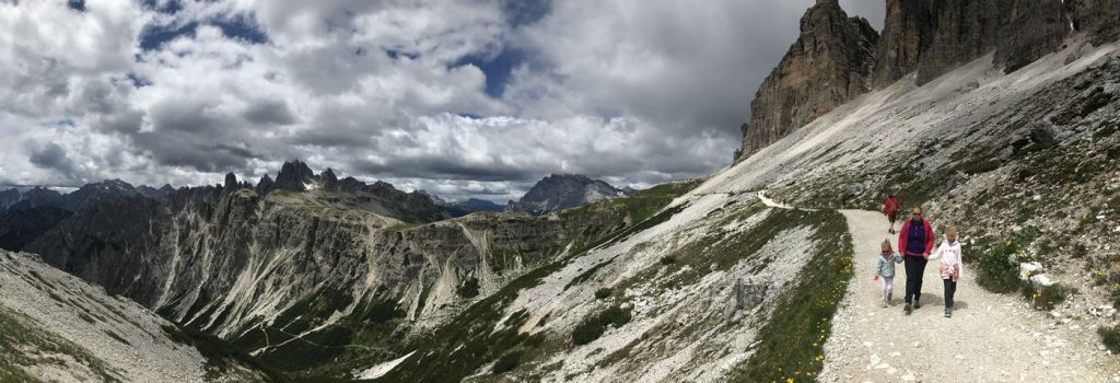 We komen tot dichtbij de Tre Cime en maken veel foto’s. Anika loopt alles zelf en doet het heel goed. Hier en daar met wat hilarische strekoefeningen tussendoor, maar daarna kan ze weer verder geeft ze aan en daar doen we het voor.
