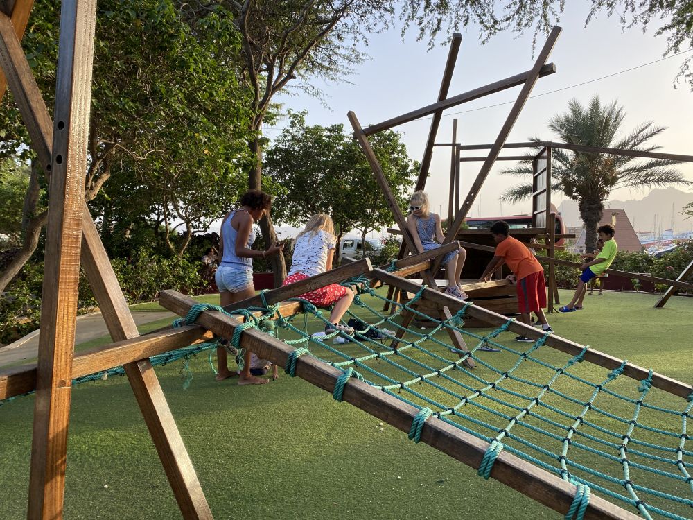 Onderweg komen we nog een leuke speeltuin vlakbij de haven tegen. Daar mogen de meisjes even los. Vooral de wip met contragewicht, waardoor Madouc ook Anika omhoog kan houden, valt erg goed.