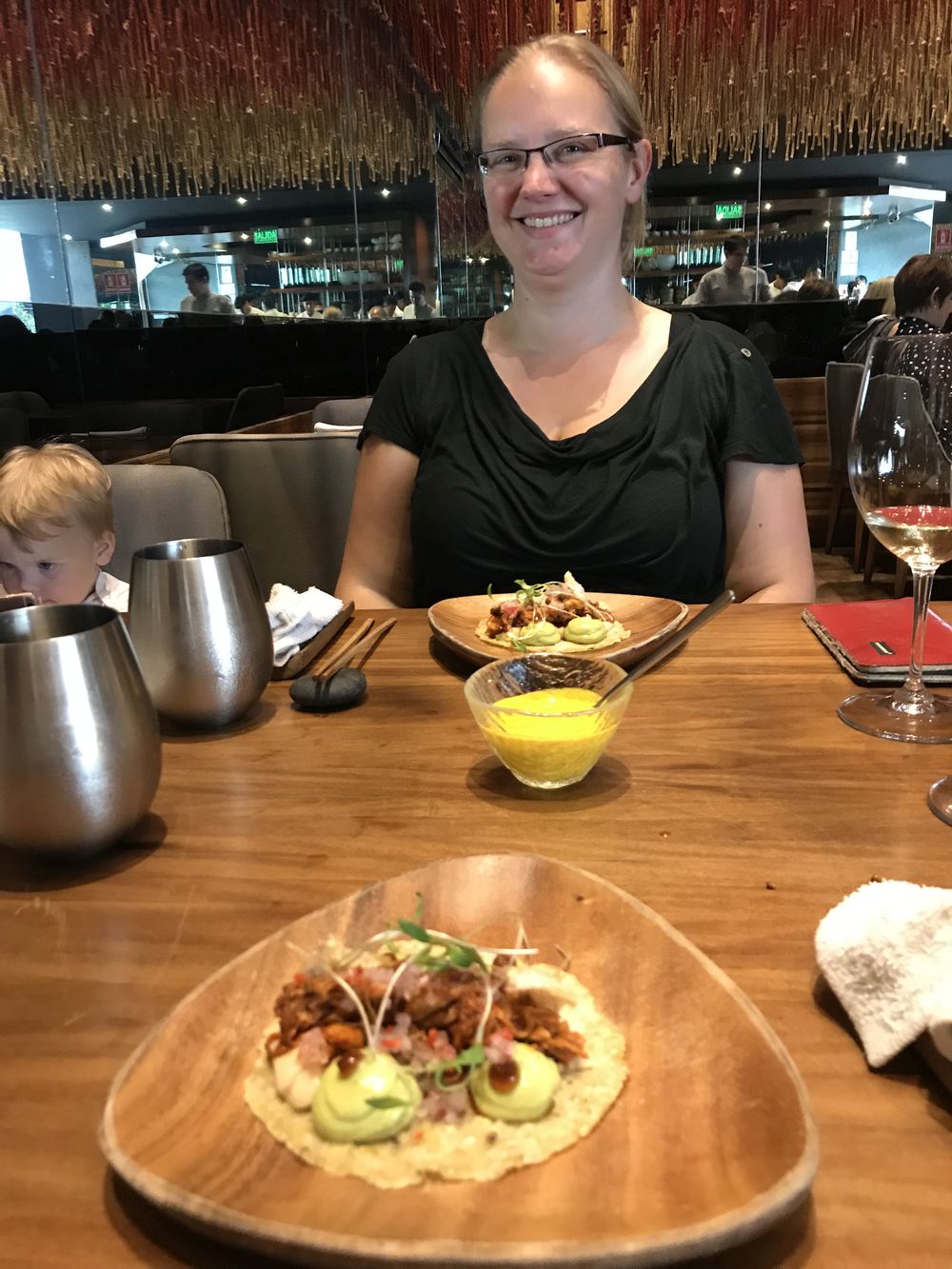 Koffers opslaan en daarna door naar het restaurant. Maaike lekker in de outfit die we gister hebben gekocht.