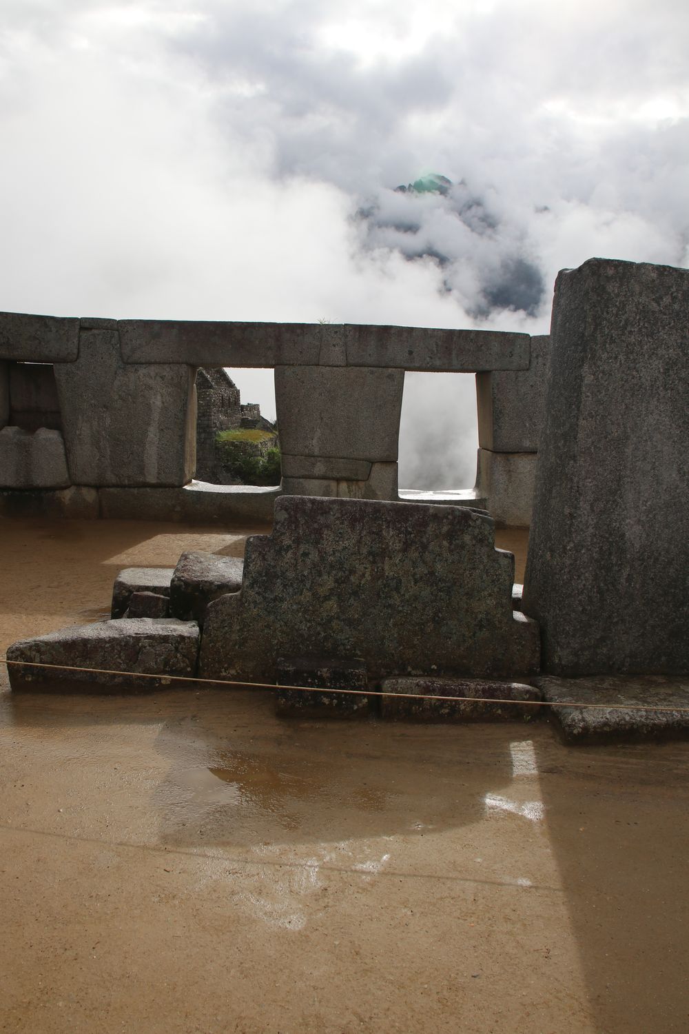 De regen wordt langzaam wat minder en stopt uiteindelijk, maar het wolkendek blijft dik. Helaas geen uitzicht vanaf Huayna Picchu op Machu Picchu. Als ik de ruïnes bovenop Huayna Picchu bereik  (die ik gisteren al vanaf Machu Picchu gezien had) lijkt het alsof de gebouwen in de wolken gebouwd zijn. Ook bijzonder om te zien.