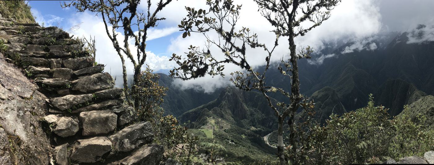 Daarna volgt nog een pad strak langs een klif, op gladde stenen en scheef, dat de smalle rand op weg naar de Inca bridge kinderspel maakt. Vanaf hier ook mooi uitzicht op de andere bergen in de omgeving en daarachter, in de verte  Machu Picchu zelf.