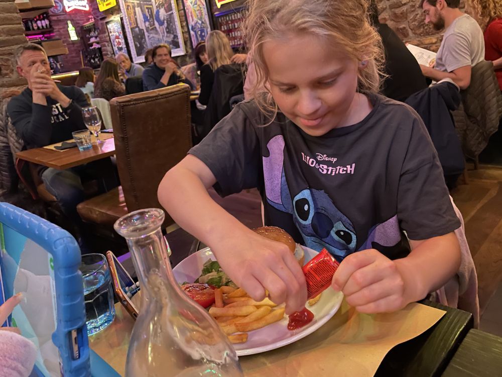 Het begint ook lichtjes te spetteren. We eten wat in een hip restaurant vlakbij ons hotel, waarvoor we ook nog even in de rij moeten wachten tot een tafeltje vrij is, dus dat moet wel goed zijn.